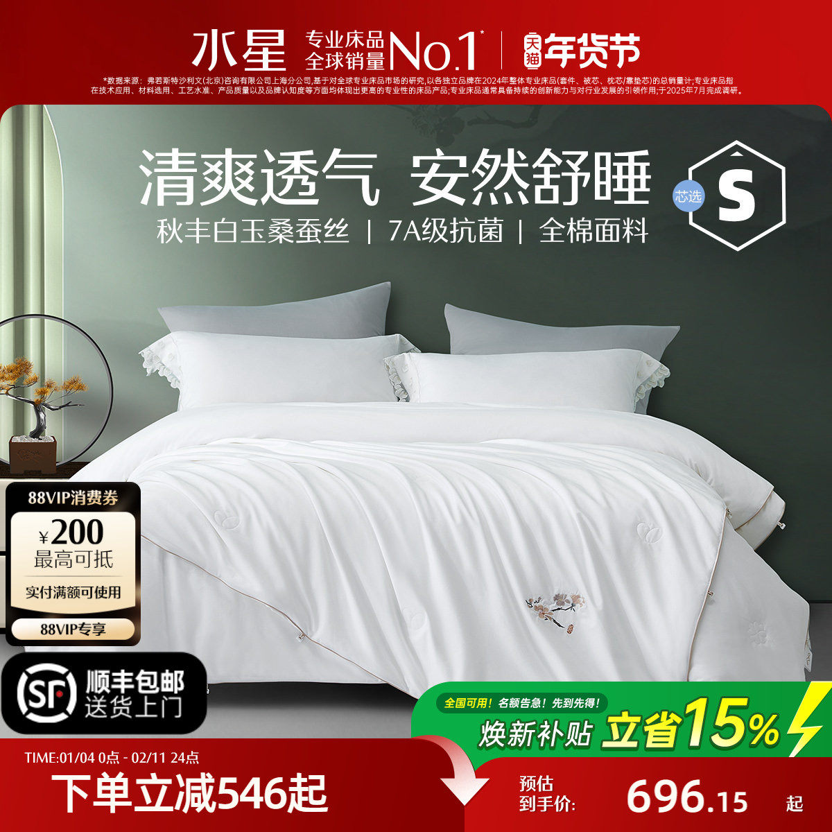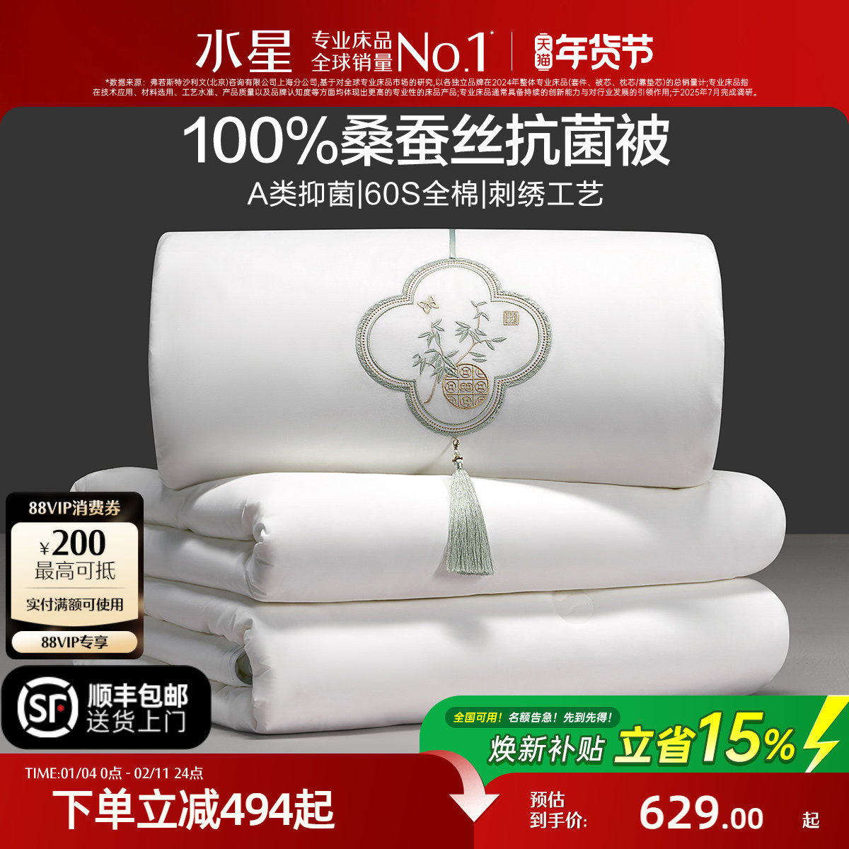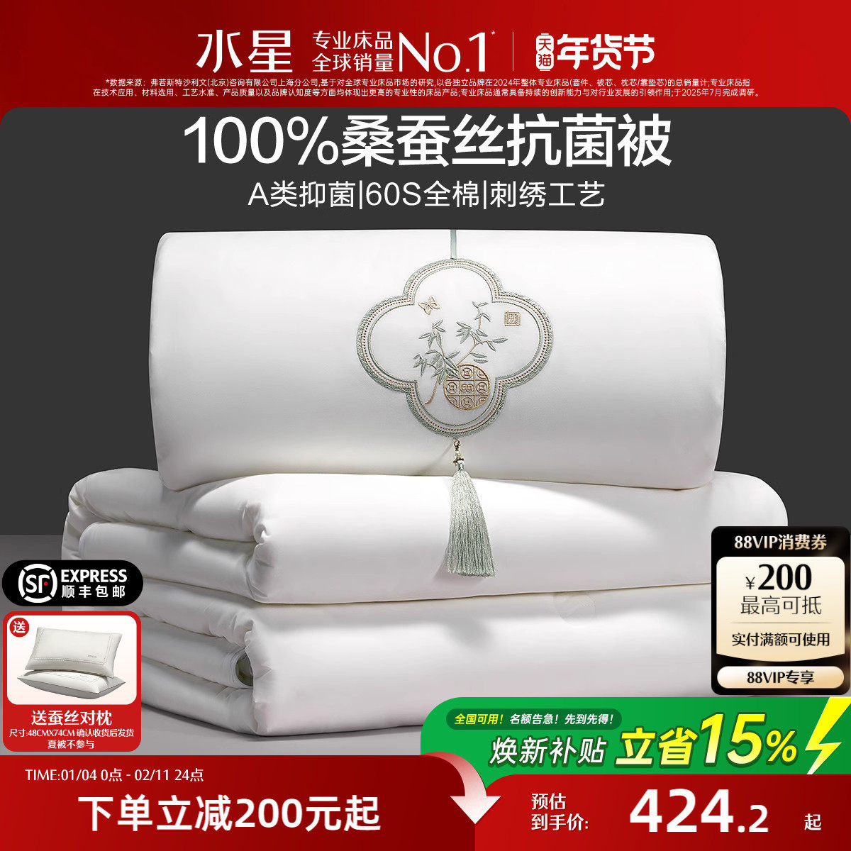 水星家纺100%桑蚕丝被子母被60支全棉抗菌蚕丝结婚被子被芯新春礼