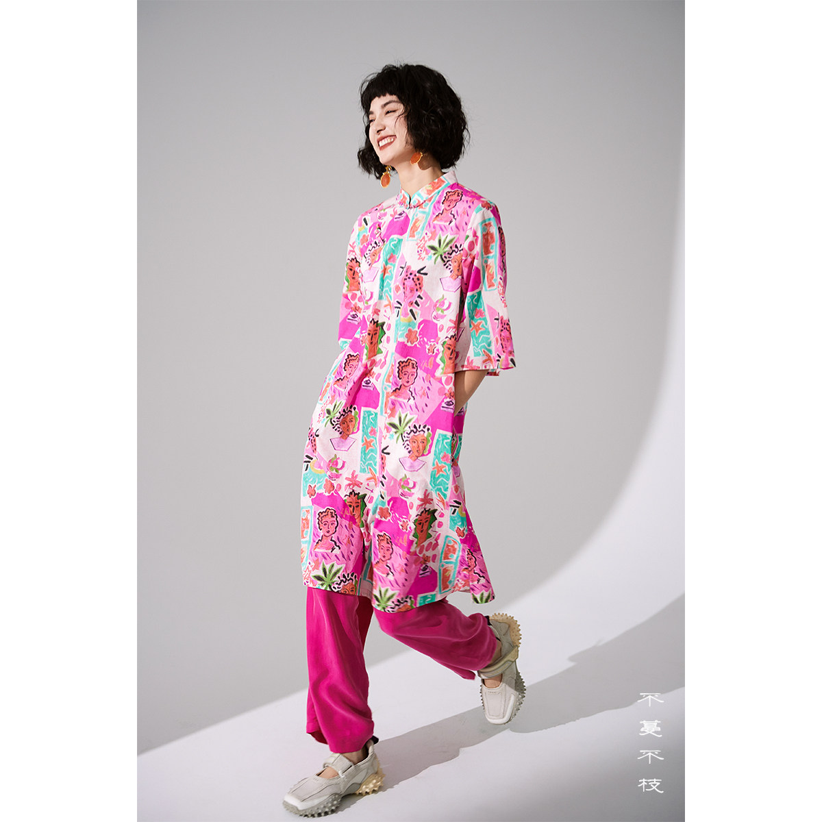 不蔓不枝【油画少女】纯棉中式印花连衣裙改良旗袍盘扣宽松文艺夏