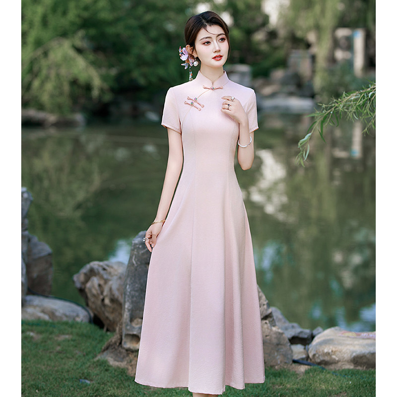 粉色旗袍连衣裙新中式女年轻款2026新款日常粉红蚀骨少女长款改良