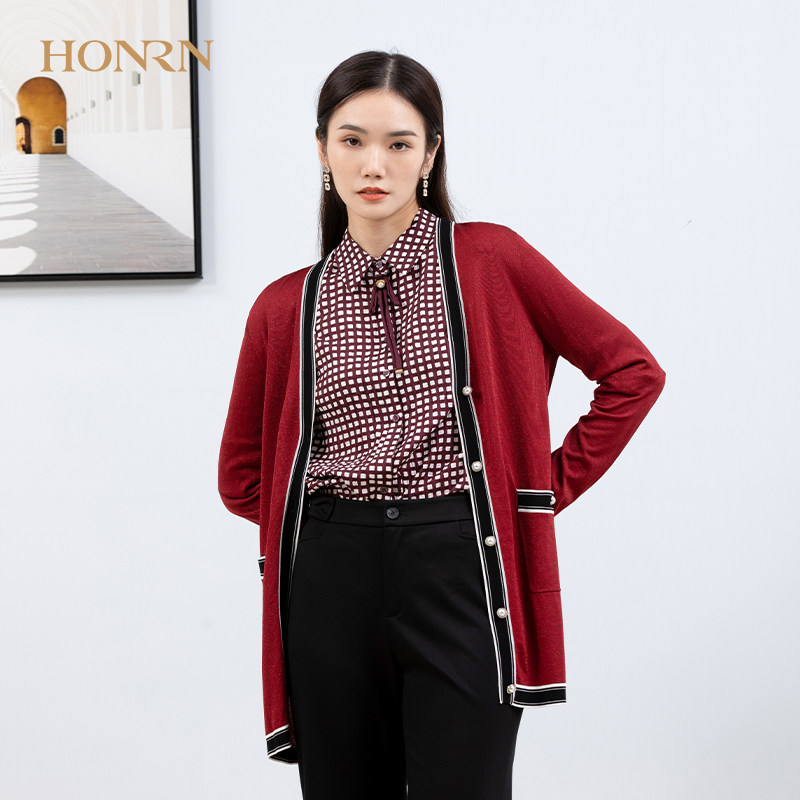 HONRN/红人气质修身红色长袖v领毛衣针织衫开衫上衣女外套春秋款
