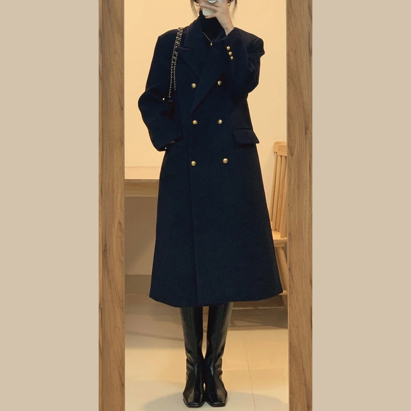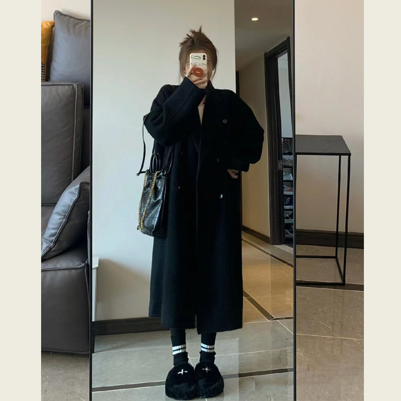 新款毛呢外套女中长款双排扣秋冬季加棉小个子呢子大衣女加厚黑色