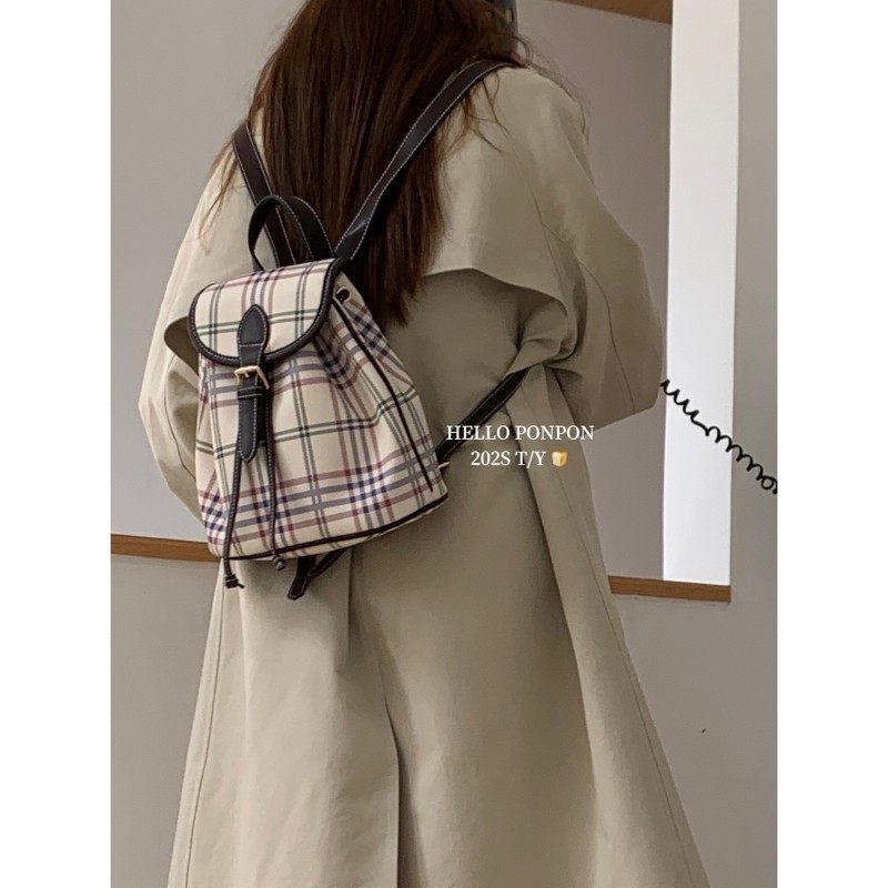 韩系新品自制百搭格纹双肩包中古学院风揹包通勤休闲水桶时尚女包