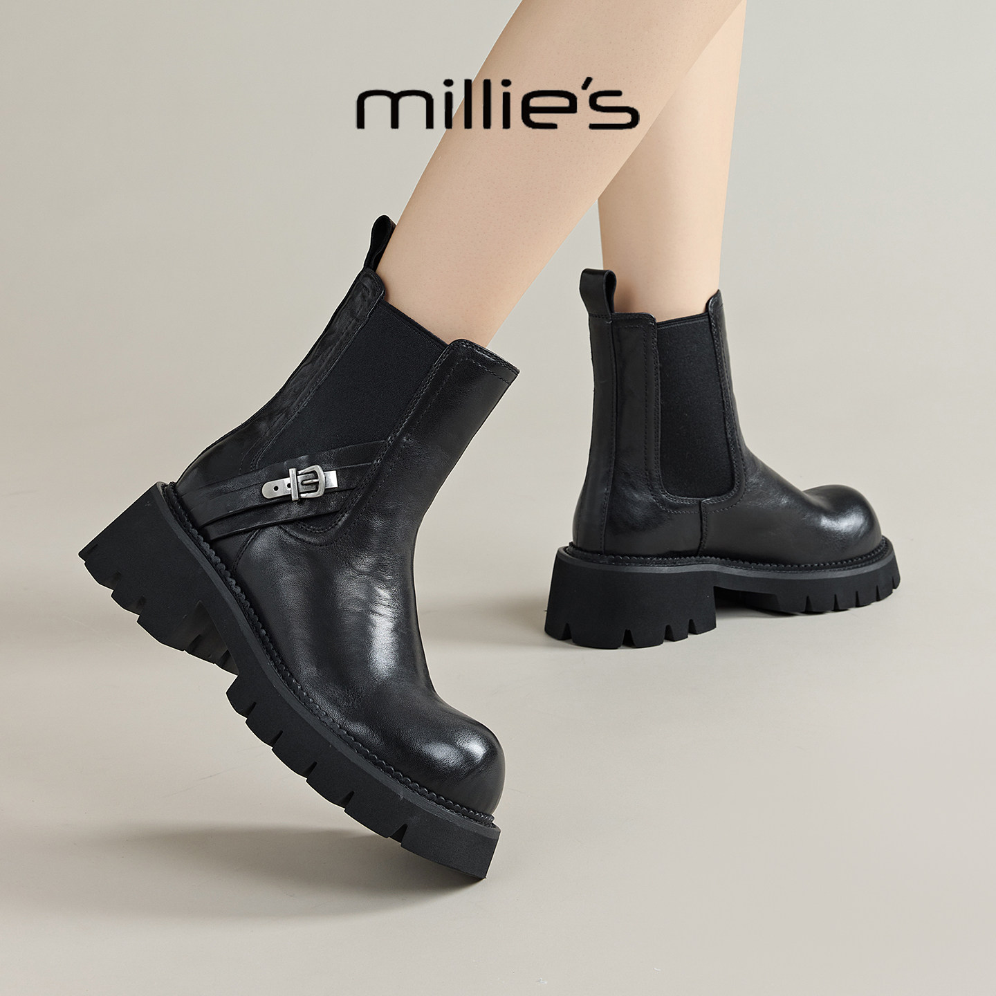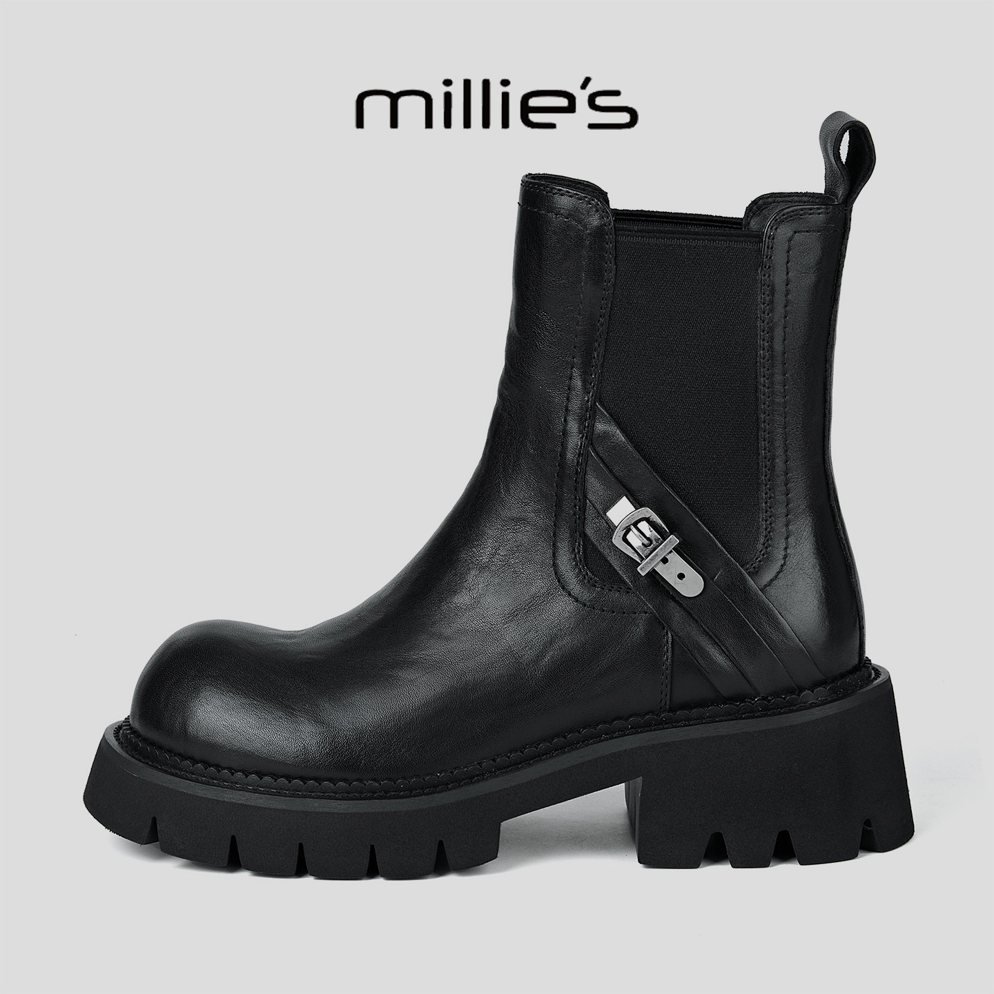 MILLIE'S/妙丽2025新款厚底切尔西靴女英伦风马丁靴女平底短靴