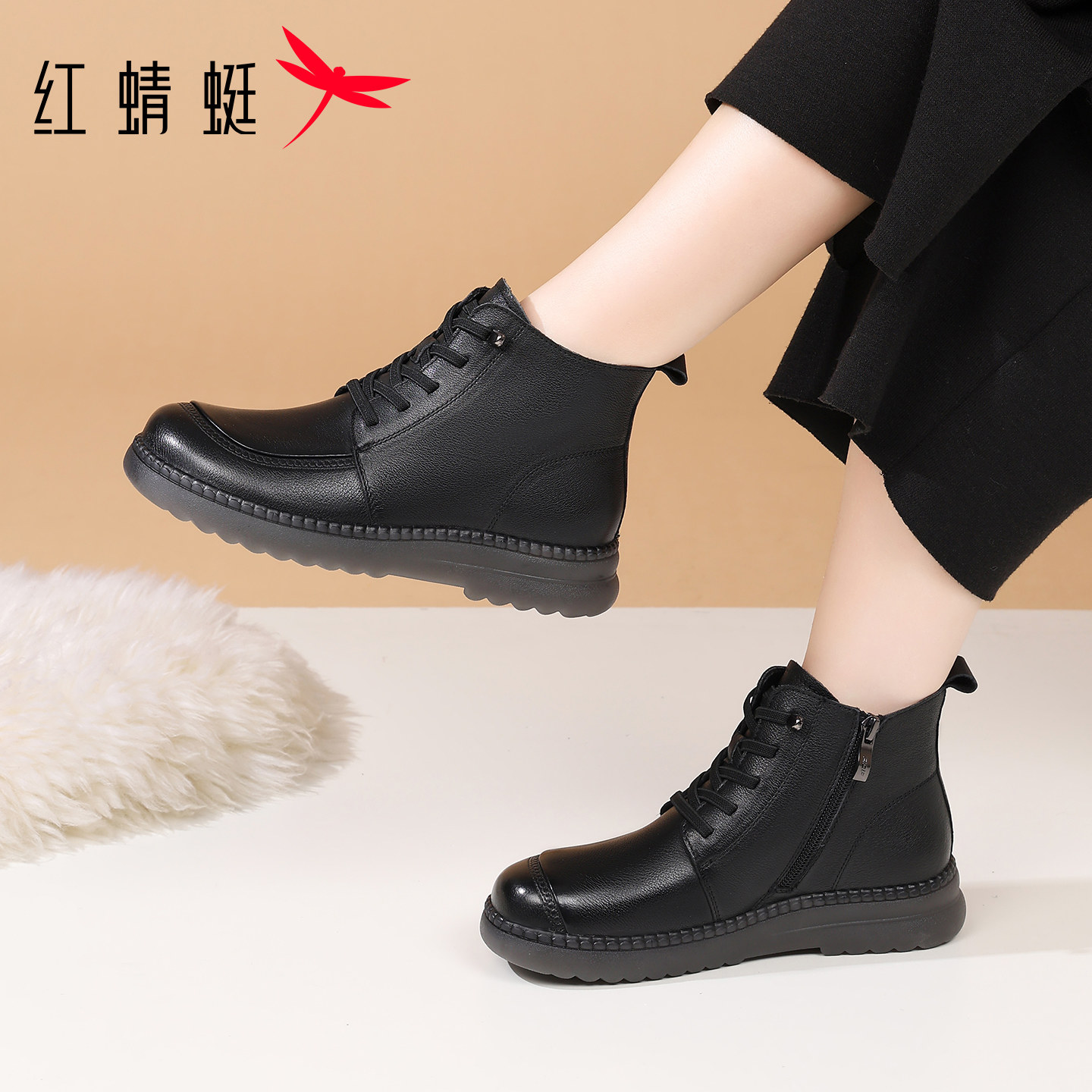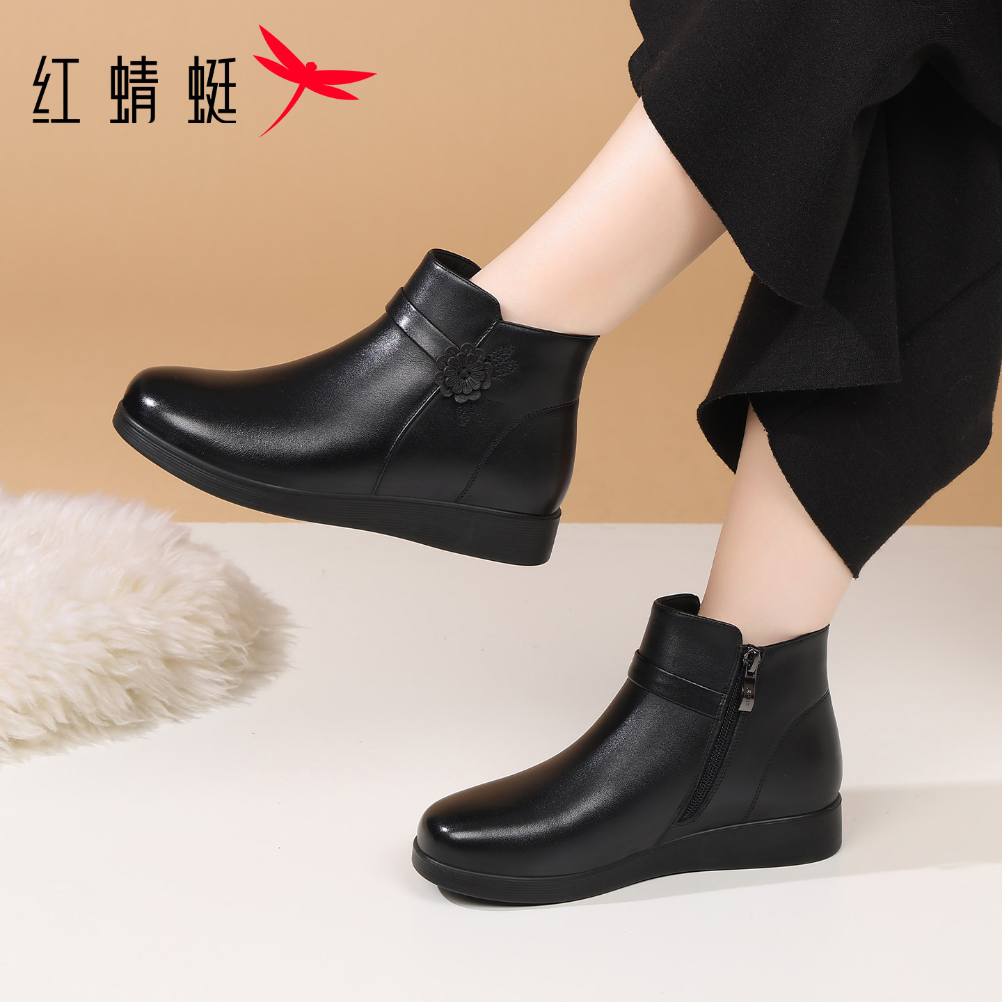 红蜻蜓冬季女鞋靴子女平底短靴真皮加绒加厚老人妈妈棉靴皮鞋冬天