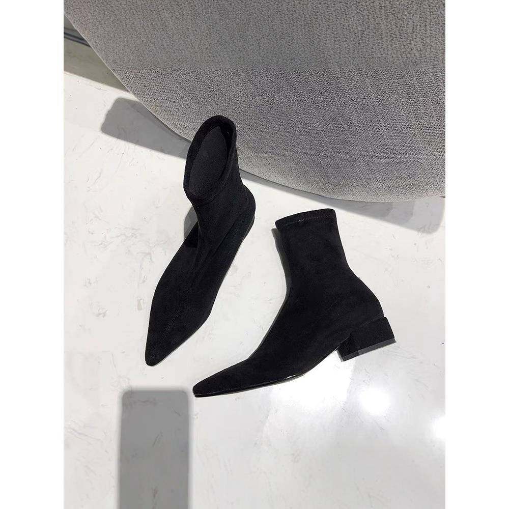 法式尖头弹力瘦瘦靴女平底短靴2025秋季新款时尚绒面粗跟单0116h