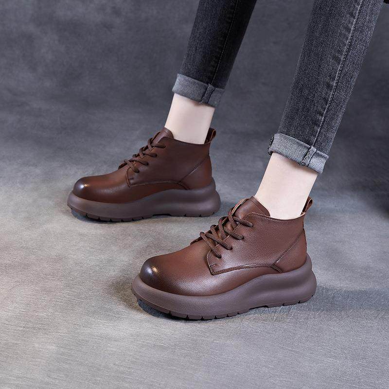 2025新款棕色复古软皮系带马丁靴女平底短靴秋冬软底真皮鞋女靴子