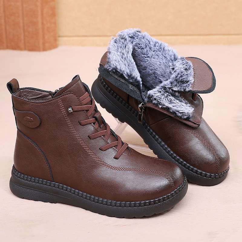 冬季妈妈老人棉鞋保暖真皮加绒皮鞋羊毛短靴女中老年大码平底防滑