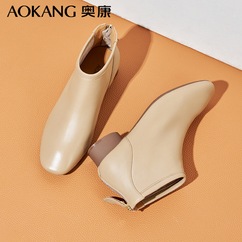 专柜断码秋冬新款软皮面加绒后拉链粗低跟是百搭瘦瘦靴女平底短靴