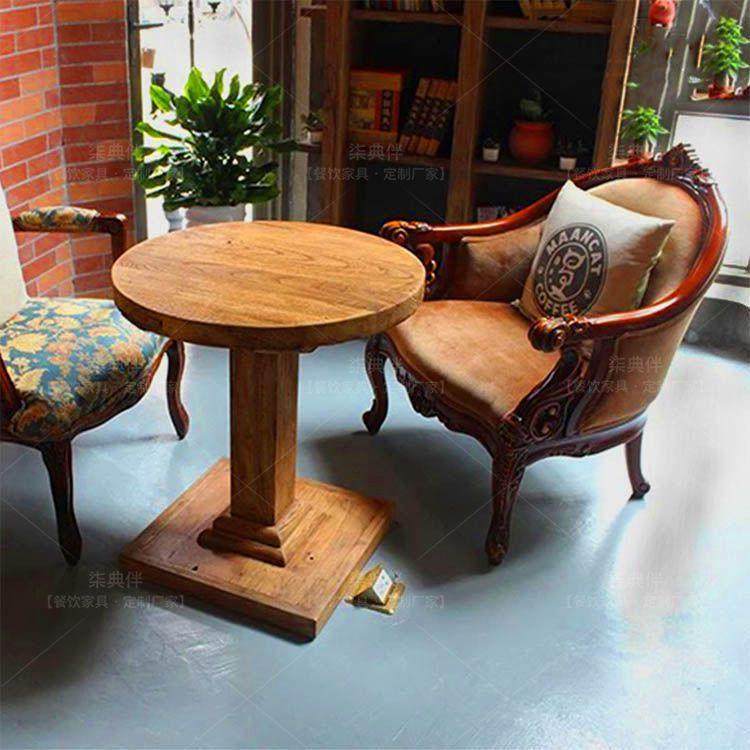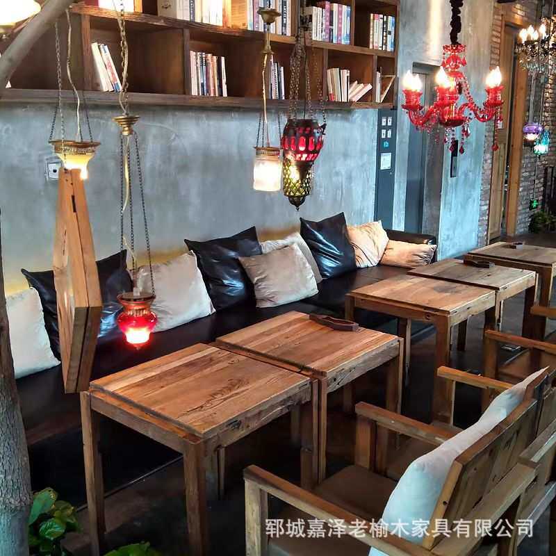 咖啡桌椅组合餐漫咖啡厅店实桌木榆木桌椅茶桌子套厅装老木做旧榆