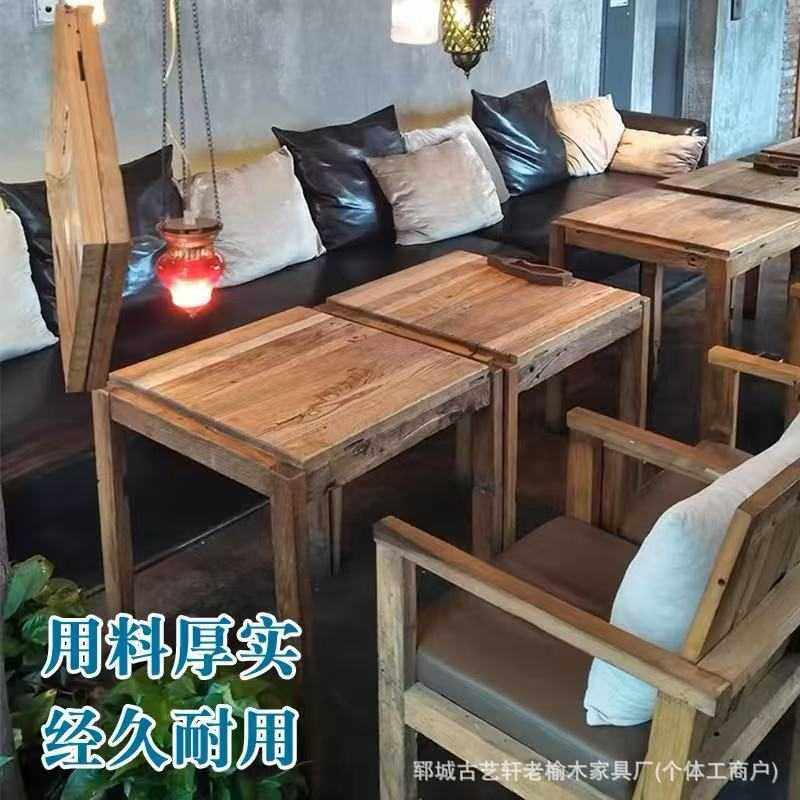 老榆木餐桌漫咖啡桌椅复古做旧全实木家具奶茶店餐厅方桌休闲木桌