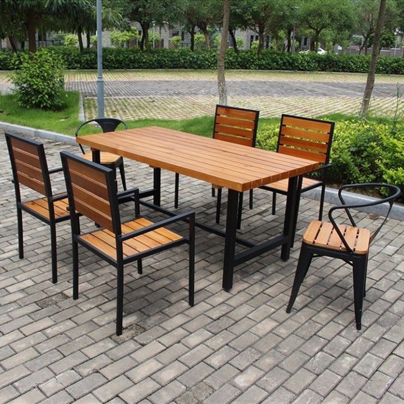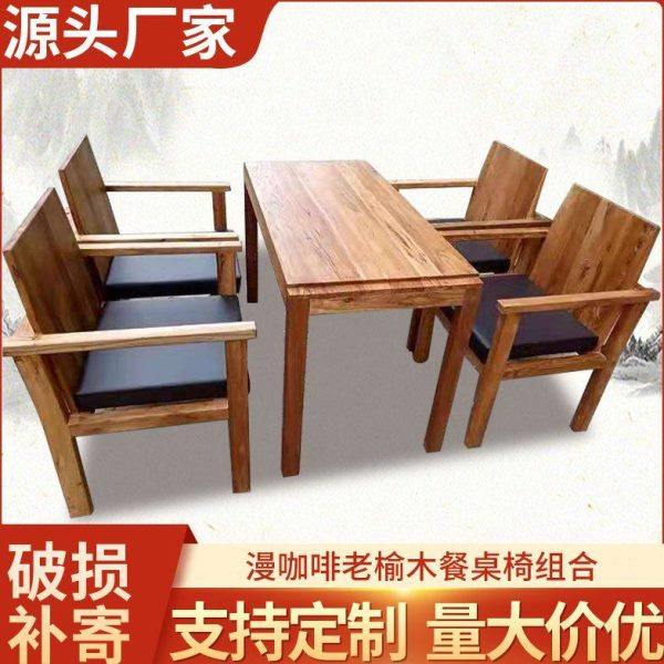 漫咖啡桌椅组合老榆木覆古做旧实木休闲方桌椅带扶手创意餐桌椅子