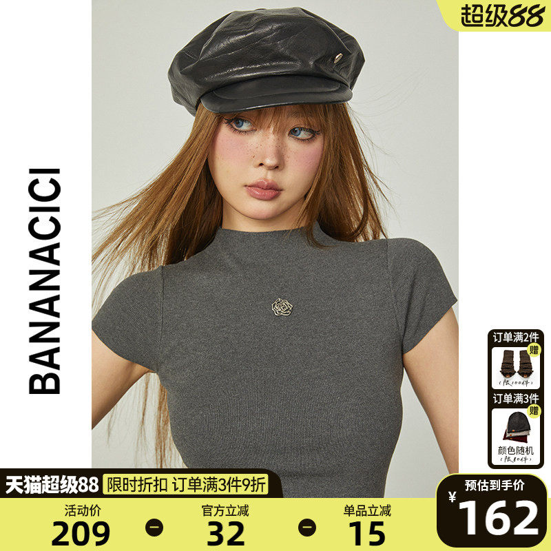 BANANA CICI2026年春季纯欲风半高领紧身短款T恤女百搭针织衫上衣