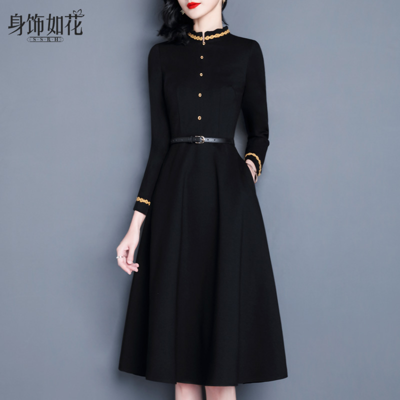 2025春秋新款淑女气质修身A字长袖小黑裙立领中裙打底黑色连衣裙