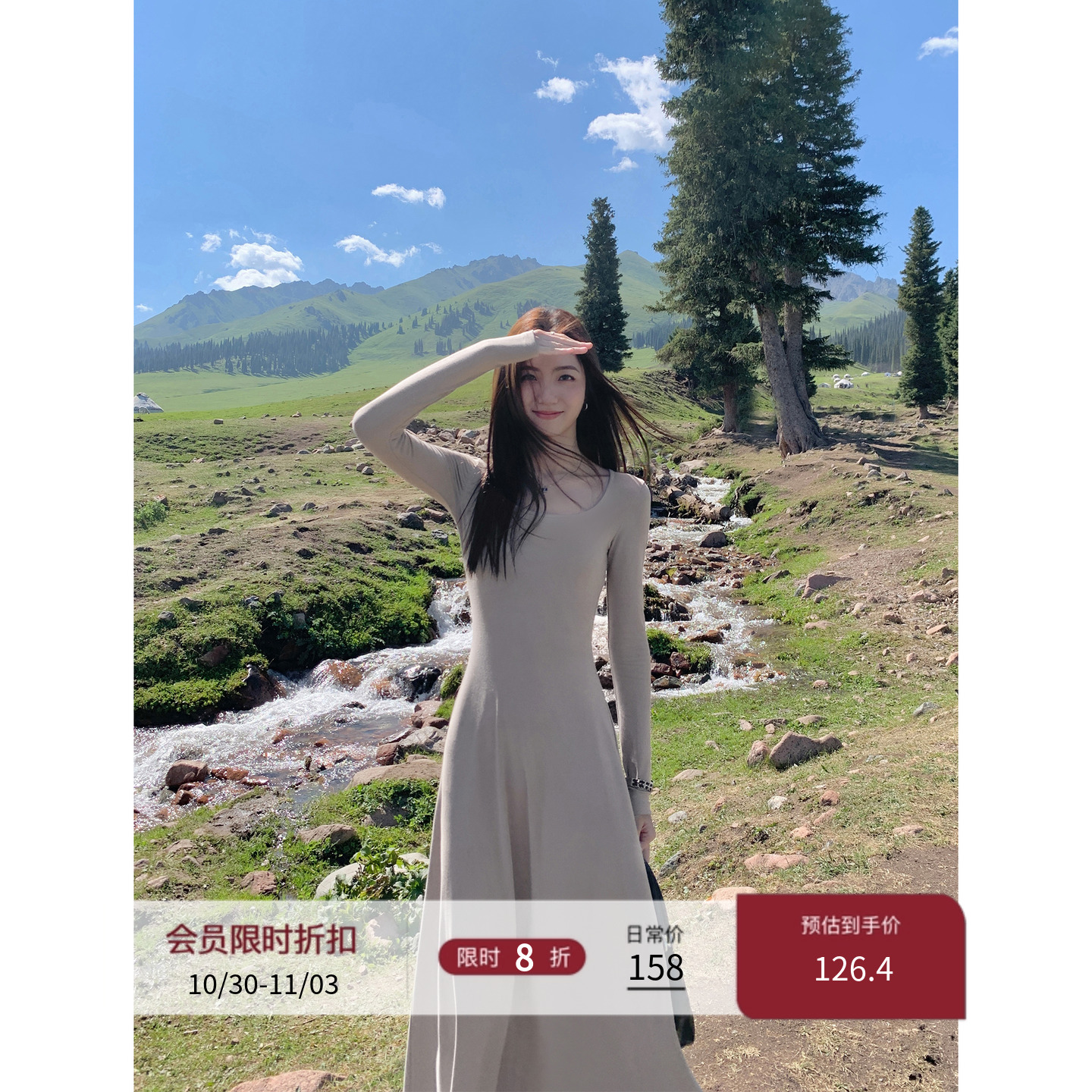 MULVAN 方领针织连衣裙女春秋修身内搭打底裙收腰显瘦a字长裙