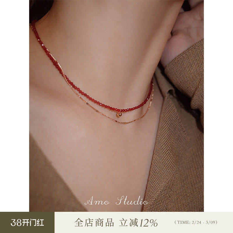 AMO一条红绳天然红玛瑙项链女纯银轻奢小众转运金珠细锁骨链显白