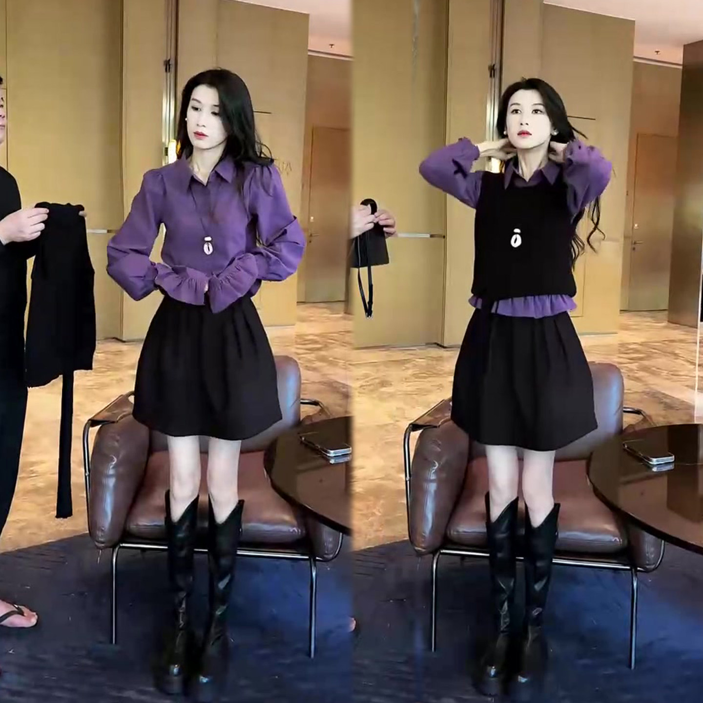 时尚韩系套装裙2025冬季新款翻领衬衫+马甲+短裙叠穿时尚穿搭三件