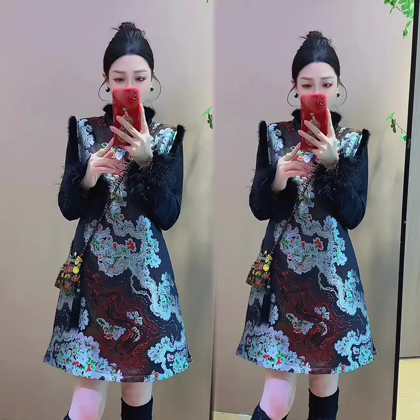 新中式套装裙2025冬季新款毛毛拼接马甲裙+打底衫网红款两件套装