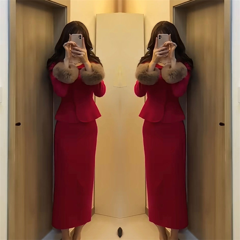 欧洲站网红爆款套装裙2022年冬季新款时尚长袖毛毛边上衣+半身裙