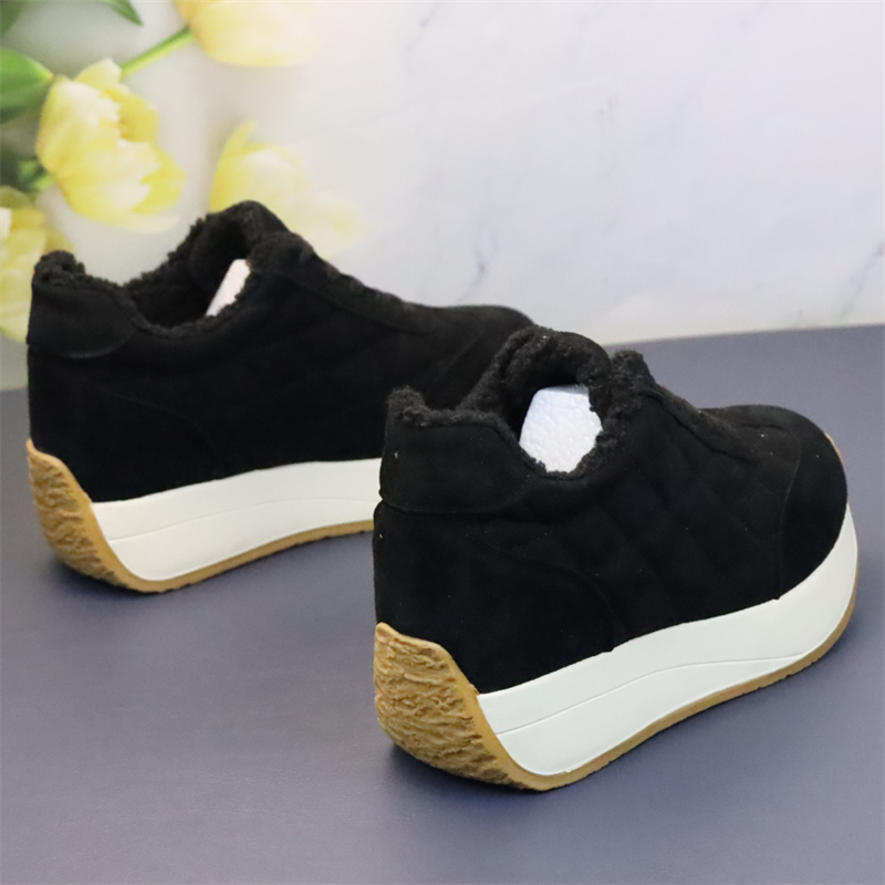 全黑超高跟12cm休闲女鞋2023秋冬新款圆头厚底松糕跟内增高加绒鞋