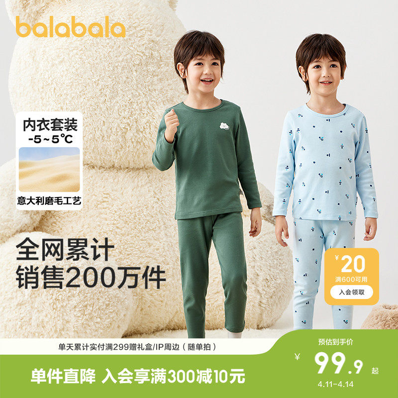 巴拉巴拉儿童内衣套装秋冬加厚男童秋衣秋裤女童睡衣发热抗菌打底