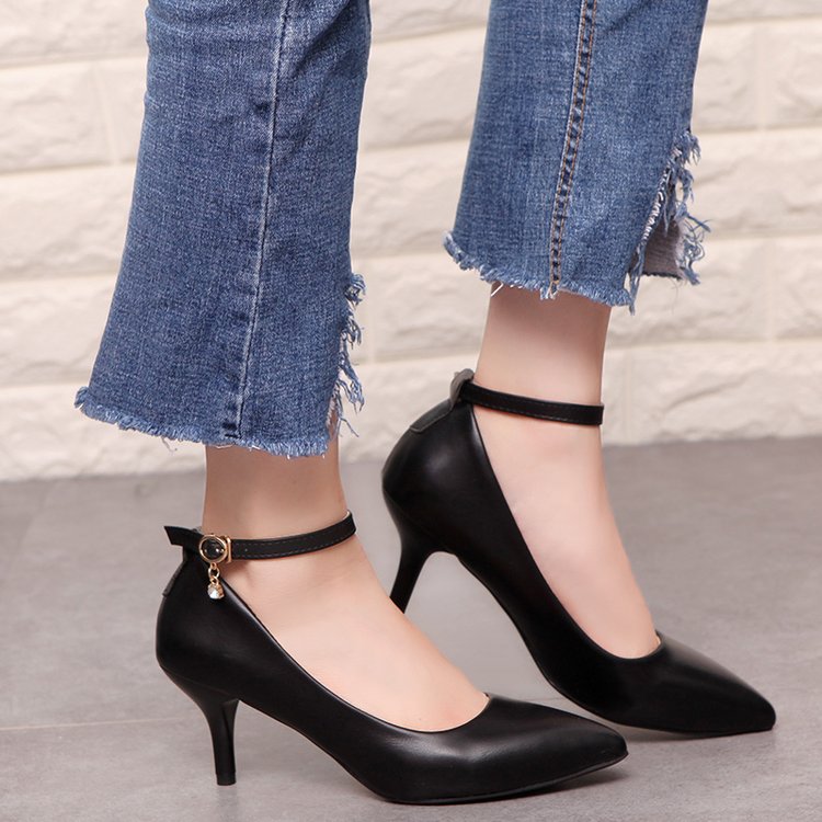 蜘蛛王女鞋2025春季水钻方扣尖头职业高跟鞋女浅口不累脚软皮单鞋