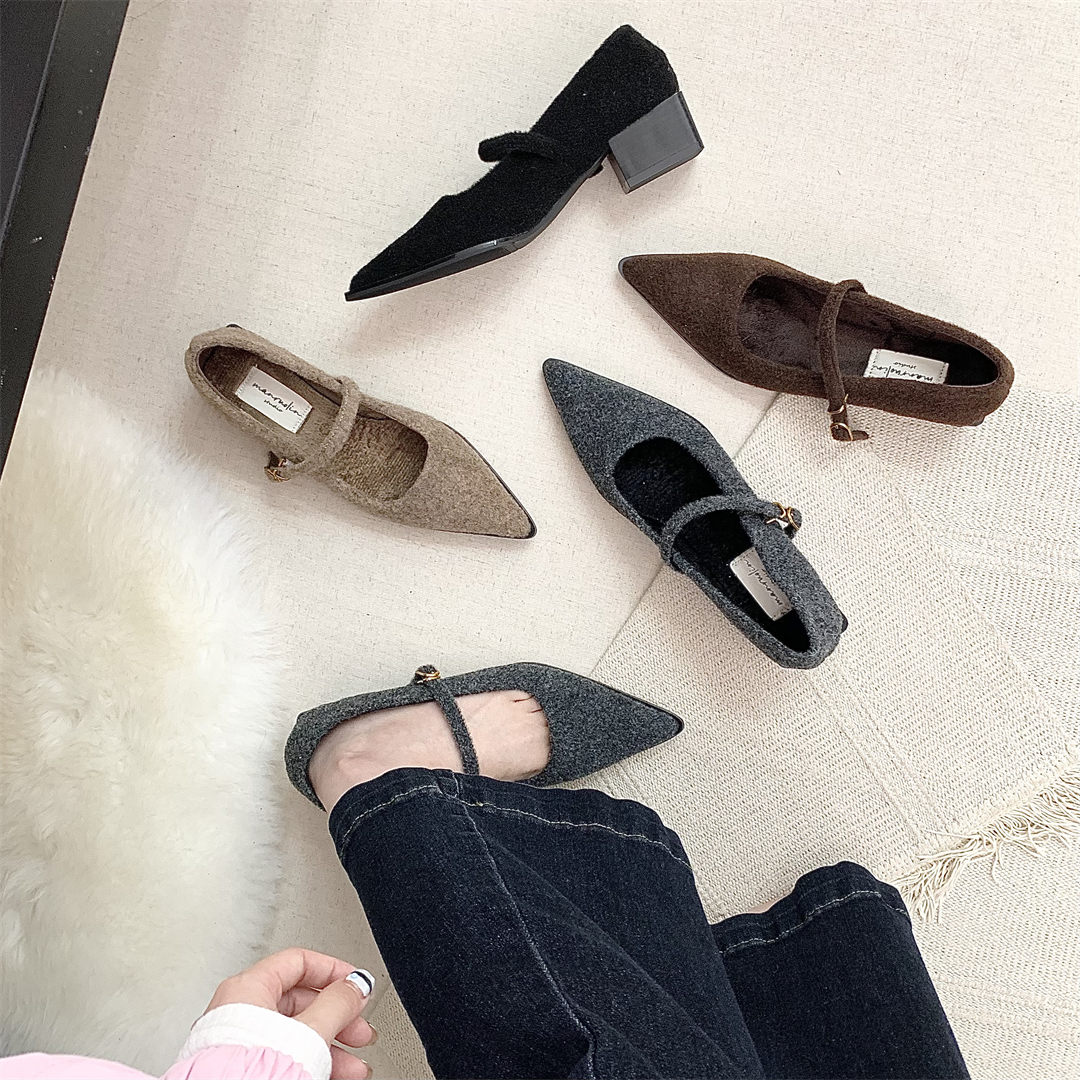 法式气质粗跟配裙子一字带玛丽珍女尖头职业高跟鞋百搭加绒女棉鞋