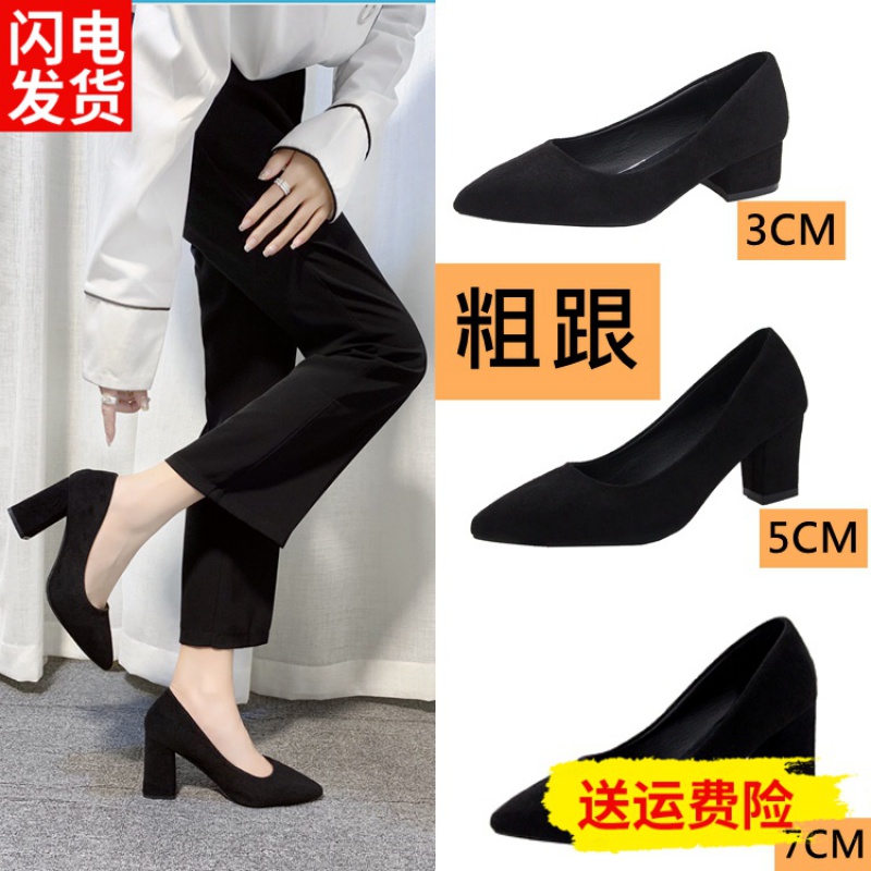 工作职业法式黑色尖头女鞋高跟鞋中跟5cm秋绒面单鞋新款气质礼仪9