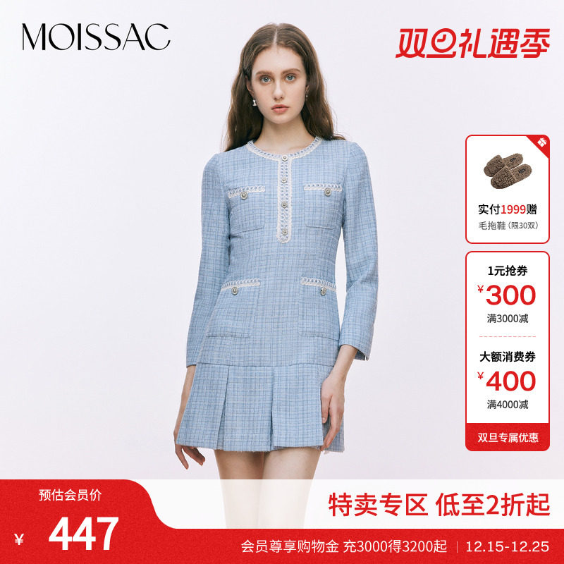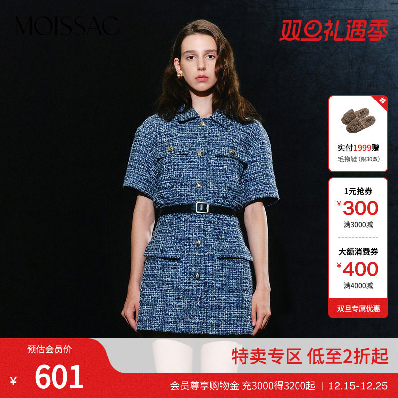 MOISSAC摩萨克冬深蓝高级小香风粗花呢收腰连衣裙女MWDD50001