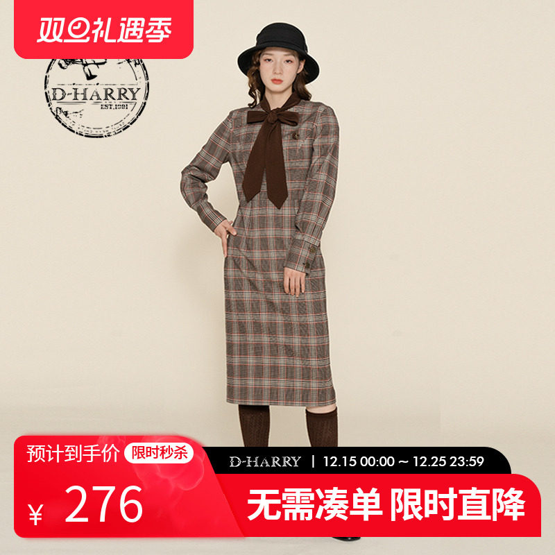 D-HARRY/迪哈利春粉色格纹收腰连衣裙女显瘦中长裙DH224J95821T