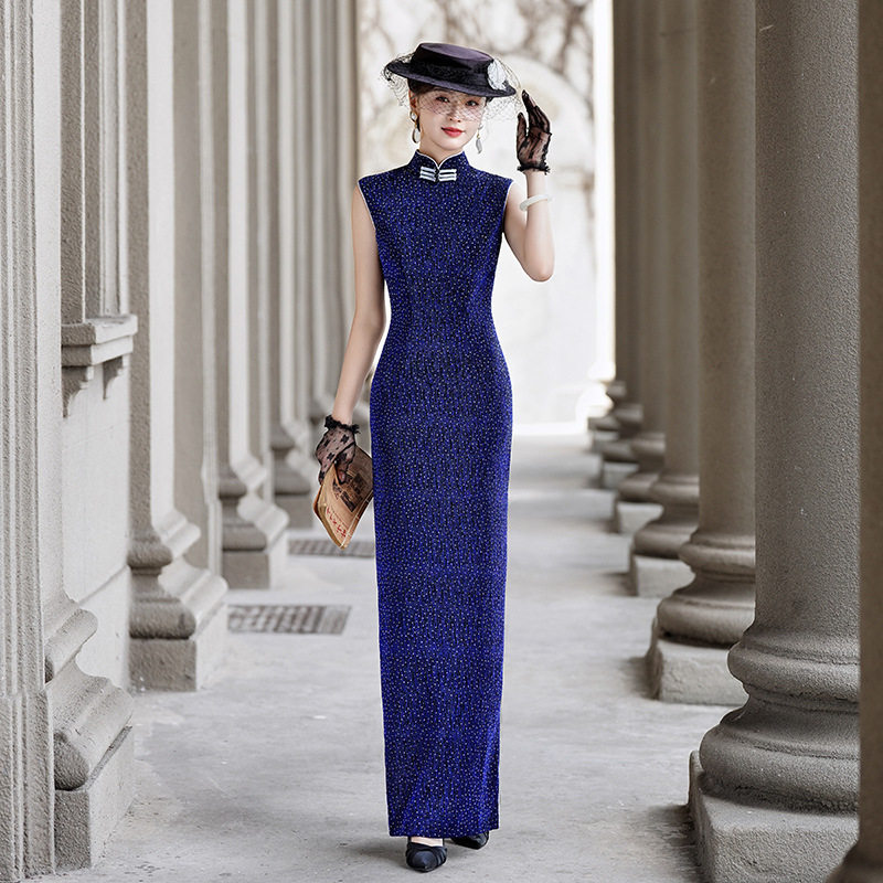 2023新款改良老上海女士丝绒旗袍式连衣裙长款中国风复古表演春秋