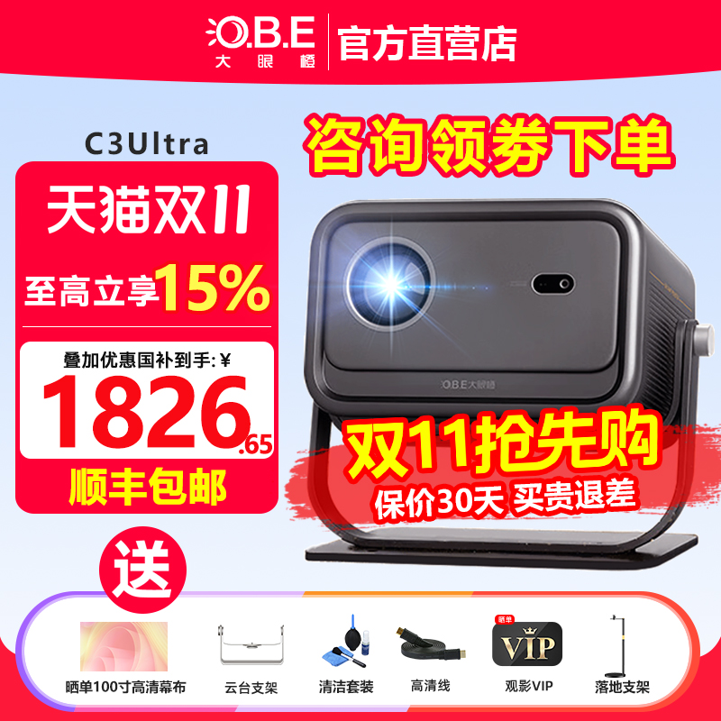 大眼橙c3ultra投影仪家用1080P高清白天放映机智能便携家庭影院高亮高刷连手机投影仪投屏一体卧室投影仪幕布