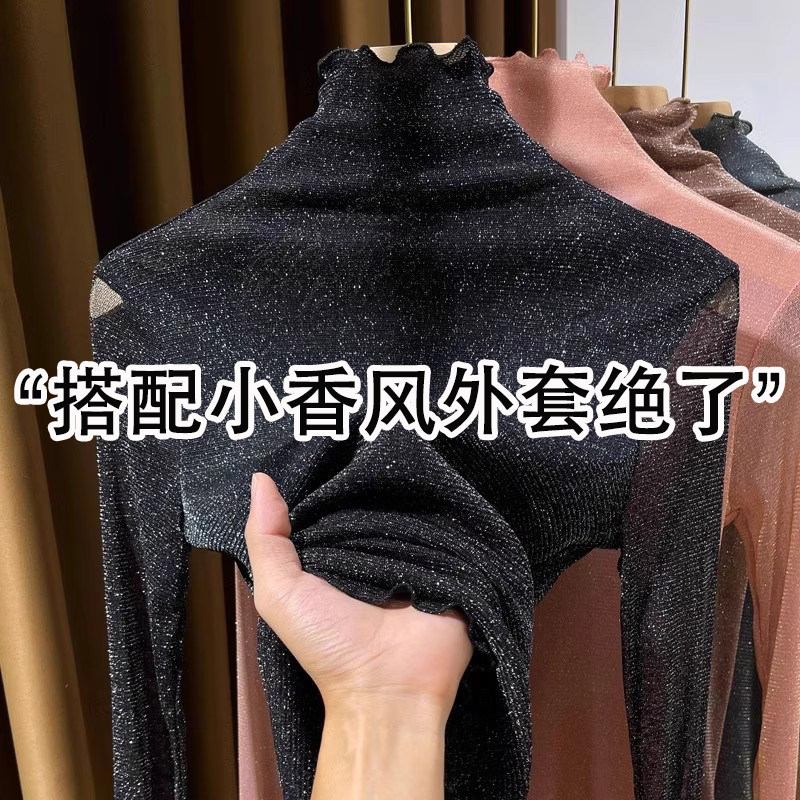 黑色高领网纱打底衫女长袖2025新款木耳边亮丝薄款蕾丝内搭小衫女