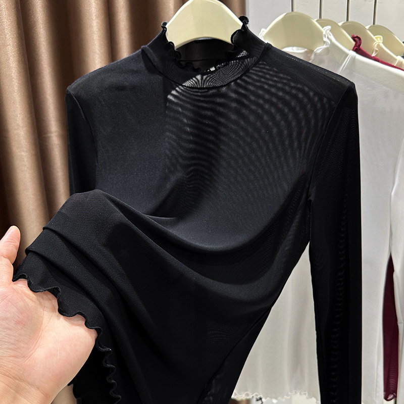 黑色高领网纱打底衫女秋冬可外穿内搭长袖T恤木耳边薄透上衣1225e