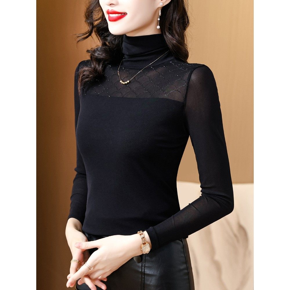 显瘦上衣高领蕾丝打底衫女秋冬2025新款洋气内搭黑色网纱镂空长袖