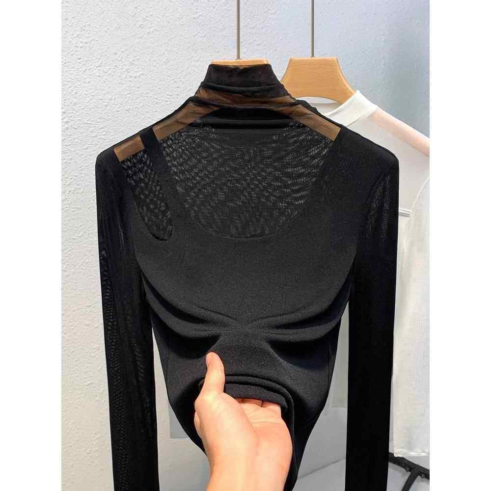 2021高领网纱打底衫女内搭纱衣黑色防晒T恤透视薄款蕾丝衫上衣
