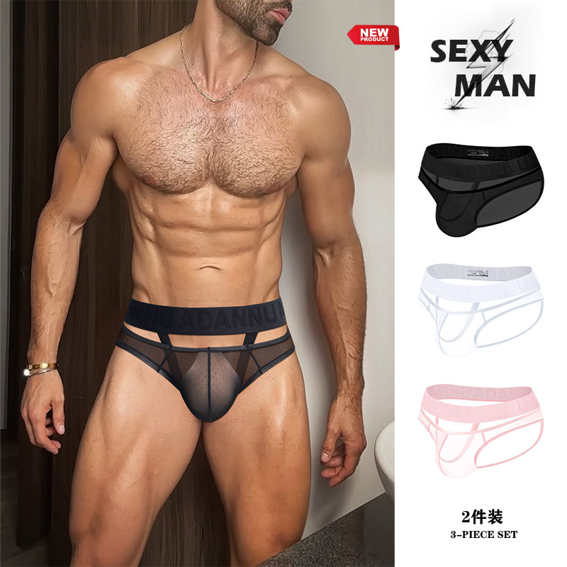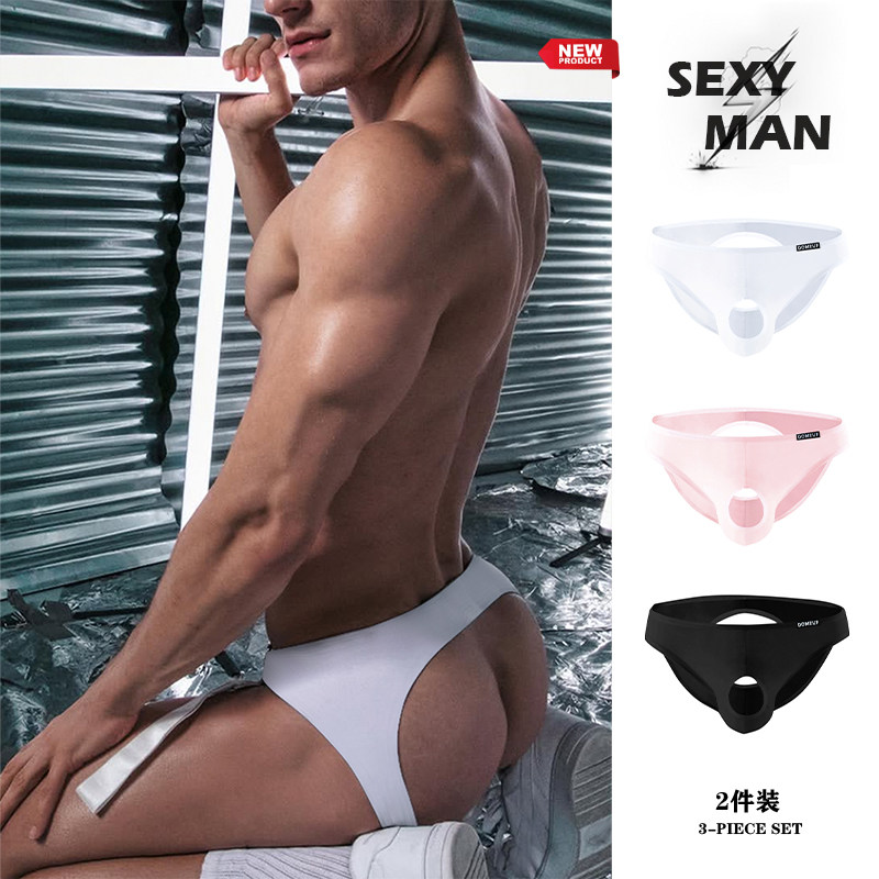 两条装男士内裤透明纯色无痕低腰三角裤镂空吊环浮雕文腰带性感潮