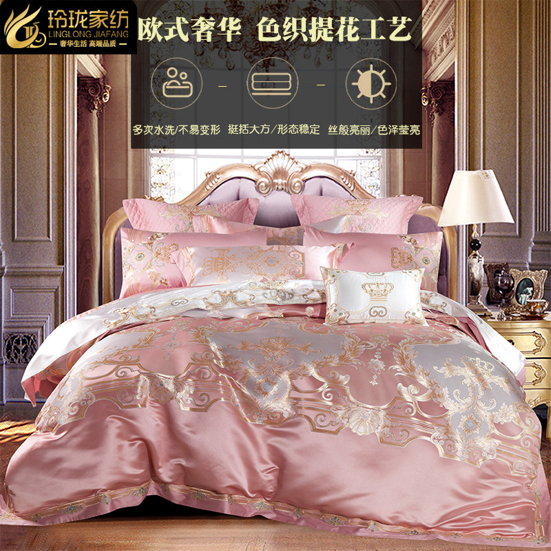 欧式高档奢华床上用品纯棉四件套轻奢浪漫粉色贡缎提花结婚庆被套