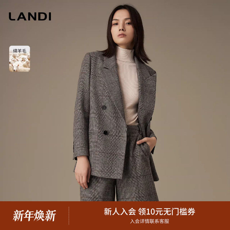 LANDI英伦复古格纹双排扣羊毛西服外套女套装西装短裤冬新品