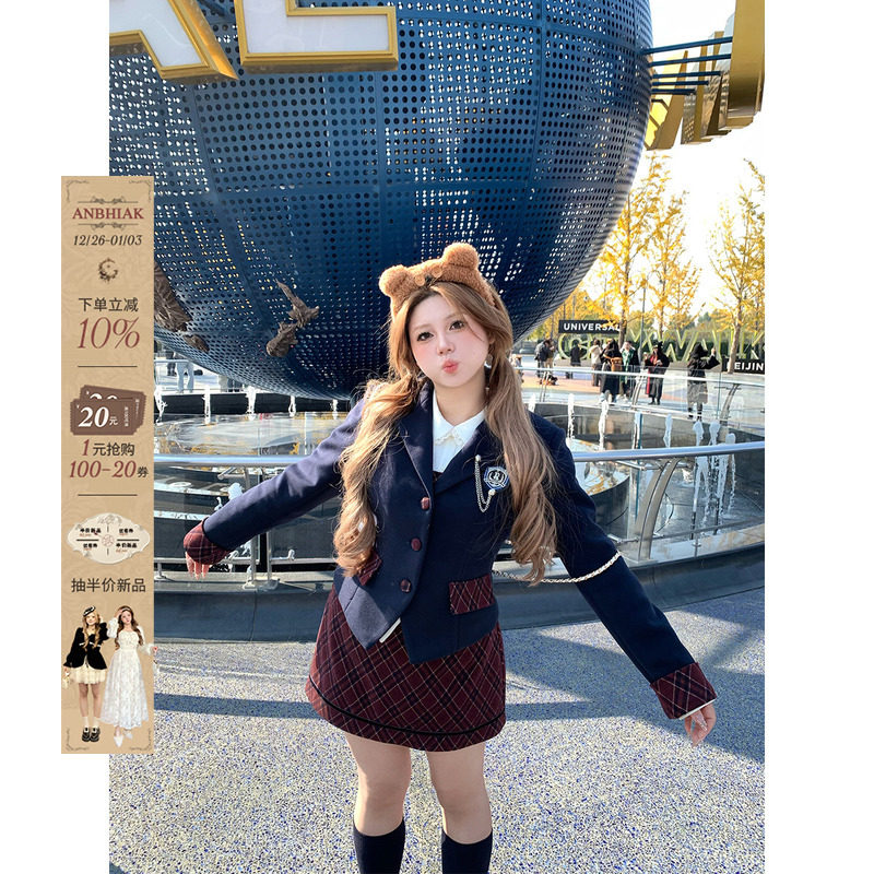 藏青色西装外套原创jk制服学院风校供甜美中长裙套装女东京岁时记