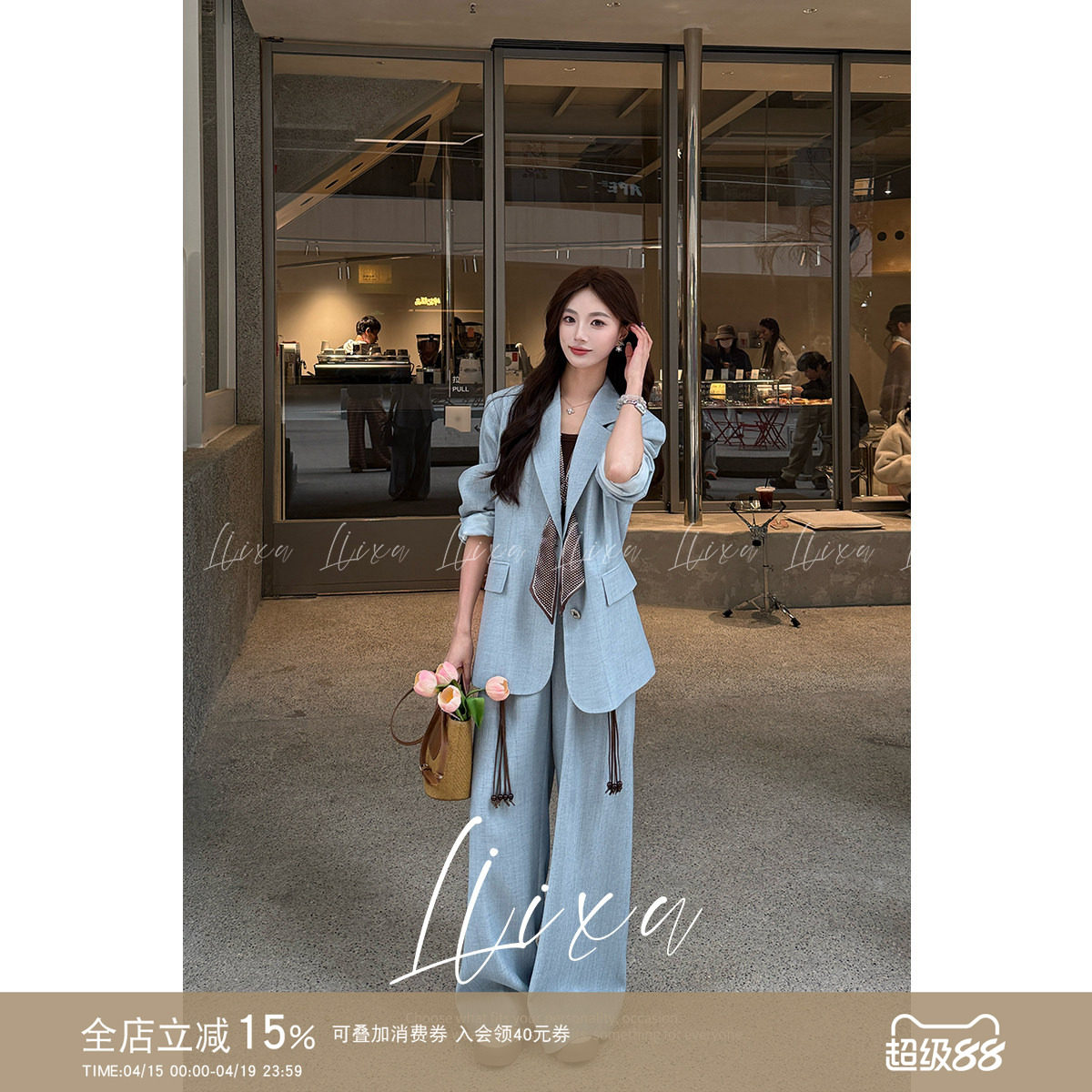 Liixu 蓝色时尚气质西装套装女春新款韩系高级感外套阔腿裤两件套