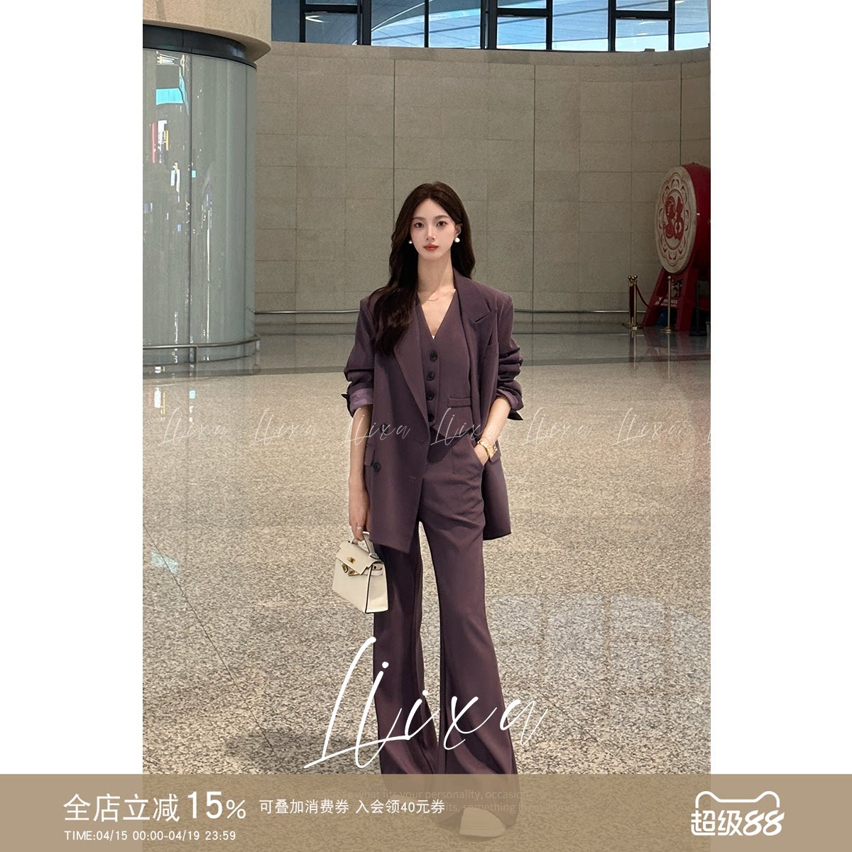 Liixu职业西装套装女春季新款高级感气质廓形西服马甲微喇裤3件套