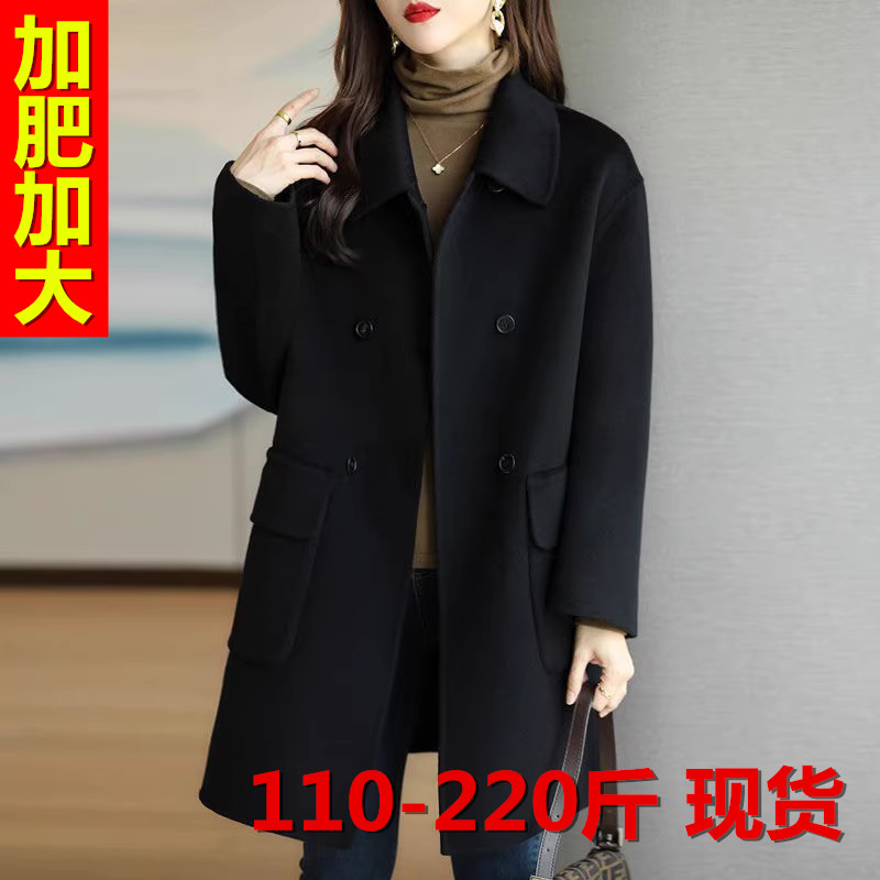 胖mm大码毛呢外套女中长款双排扣胖妹妹宽松显瘦200斤毛呢子大衣