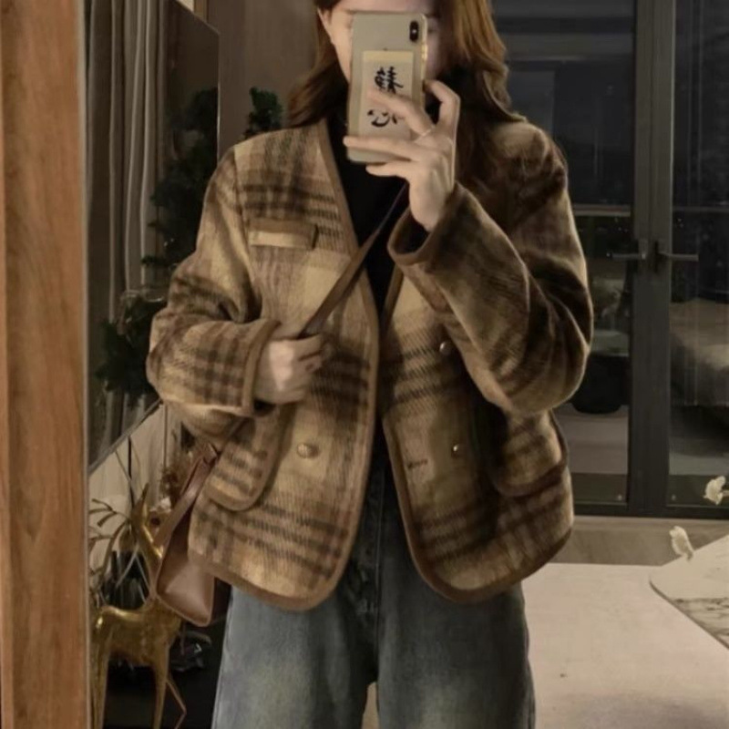 大码胖妹妹复古格纹毛呢宽松外套女新款韩系高级气质时尚休闲大衣