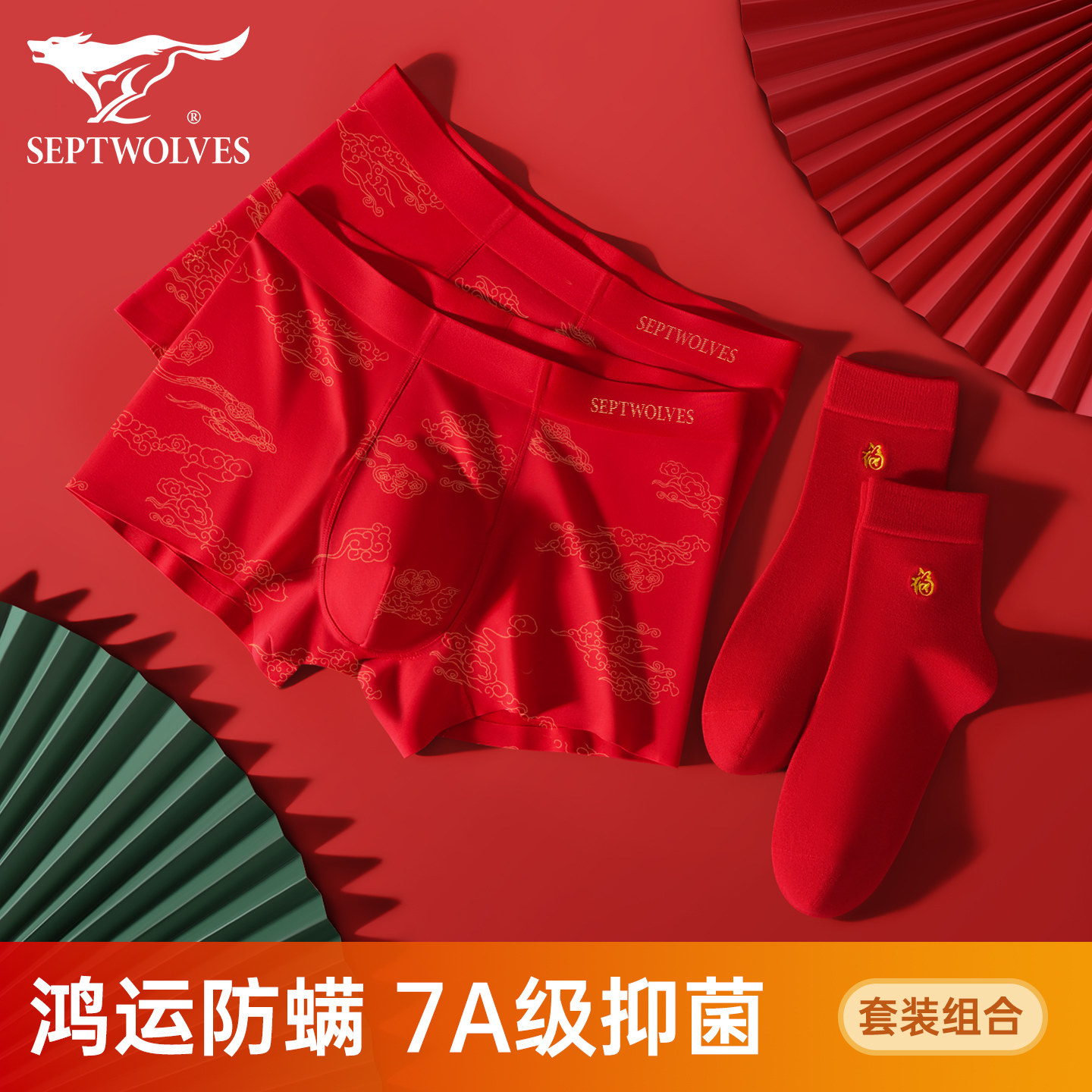 七匹狼大红色内裤男士本命年马年冰丝莫代尔结婚男生四角短裤袜子