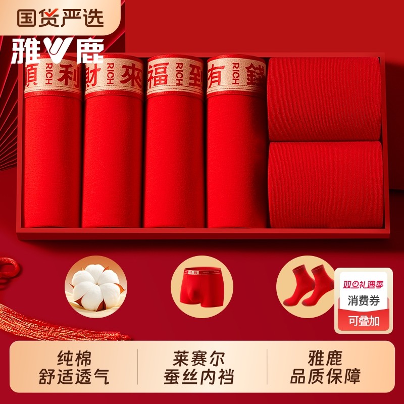 雅鹿本命年大红色内裤男士纯棉四角裤衩短裤头男生属马年结婚礼物