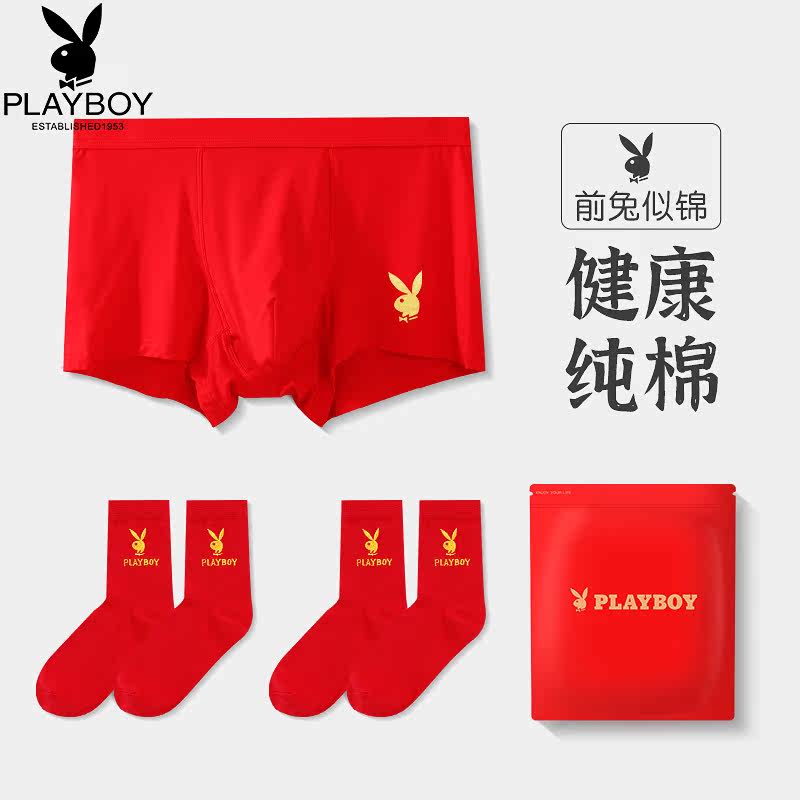 花花公子大红色内裤男士纯棉本命年单条装属兔结婚四角裤兔年礼物