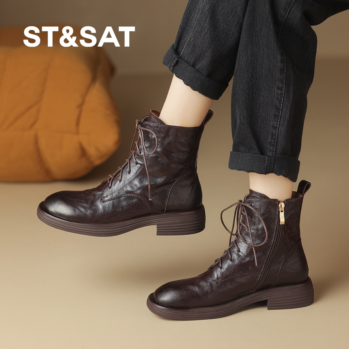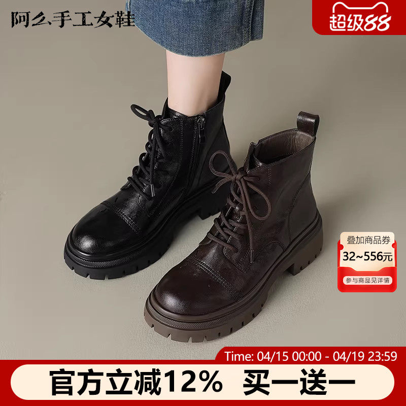 阿么手工女鞋秋冬新款真皮系带马丁靴轻便不累脚厚底百搭粗跟短靴