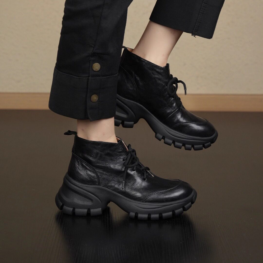 Fermina 全牛皮系带马丁靴女小个子厚底增高机车短靴百搭女鞋黑色