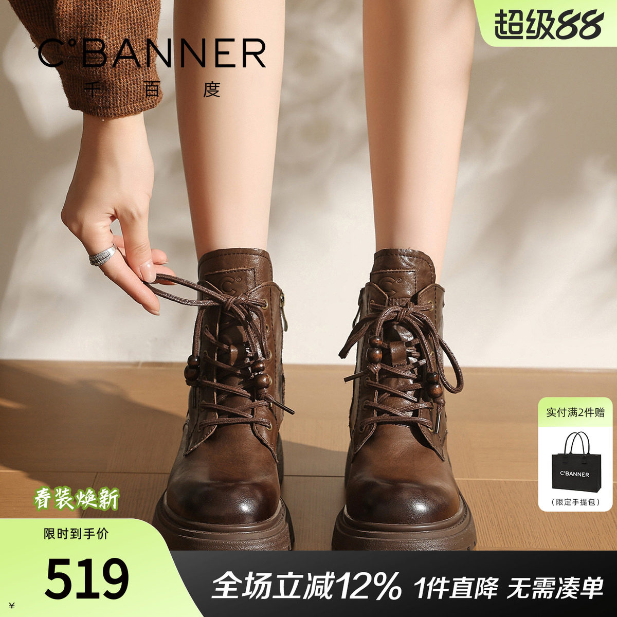 千百度手抓皮马丁靴女2025冬季新款美拉德中跟系带时尚厚底短靴子