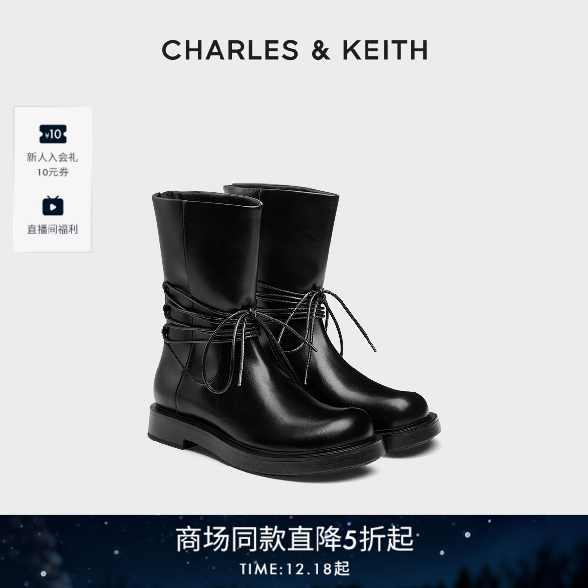 CHARLES&KEITH春季女靴CK1-90920164圆头厚底系带拉链短靴骑士靴